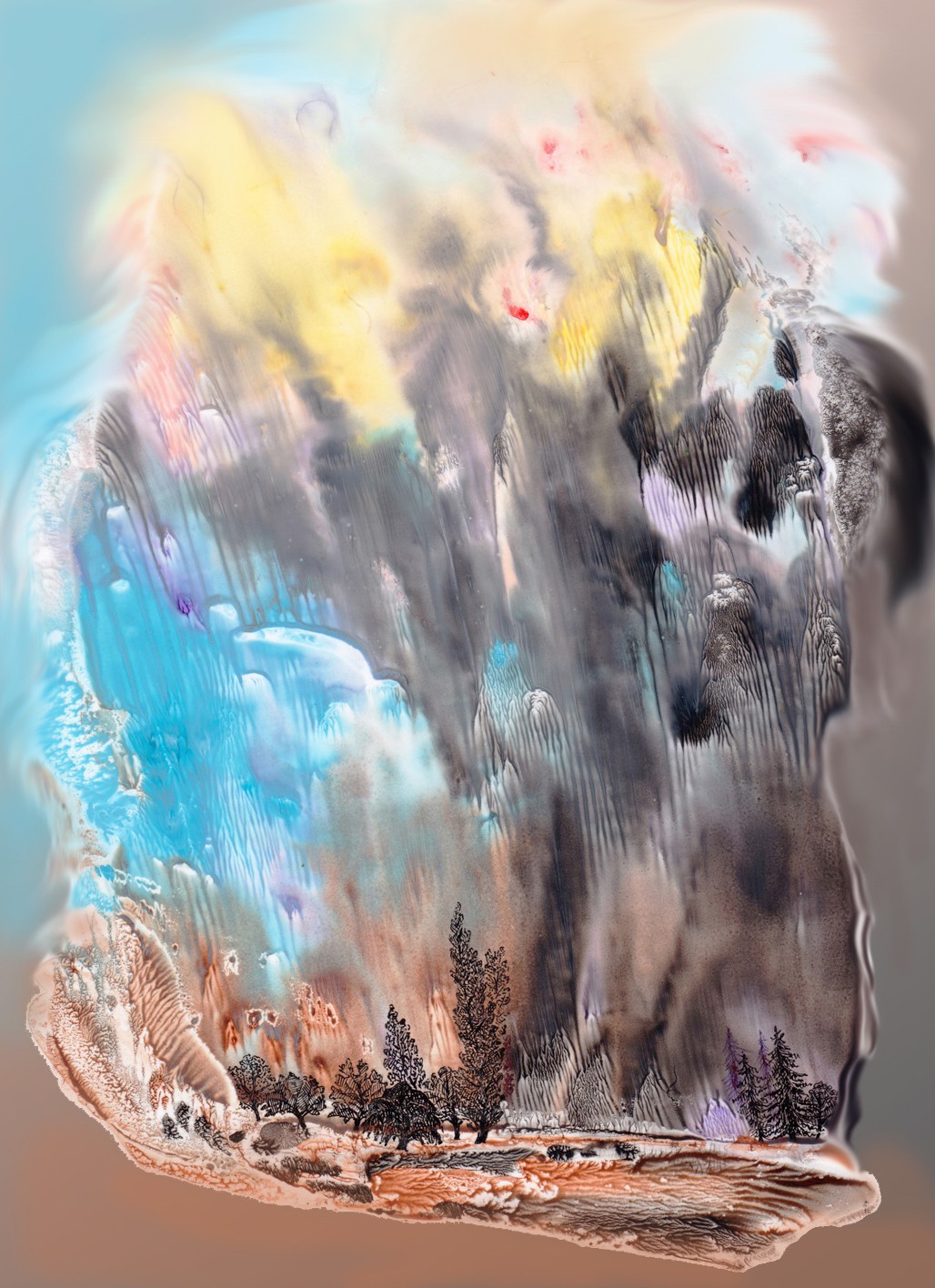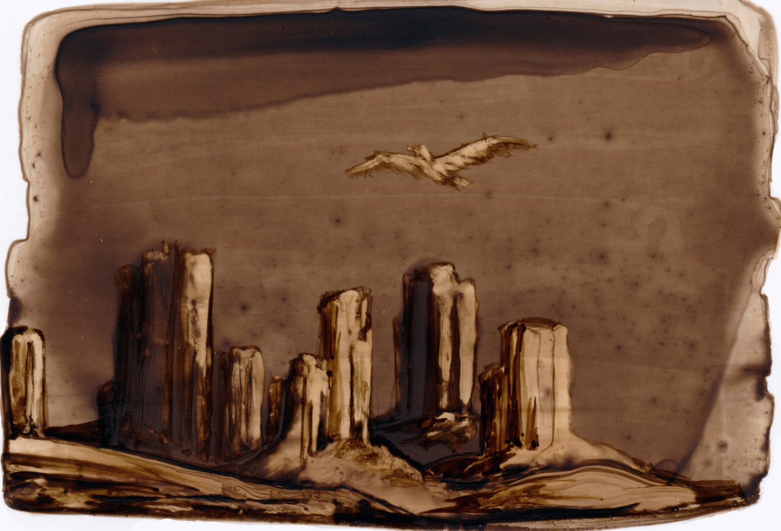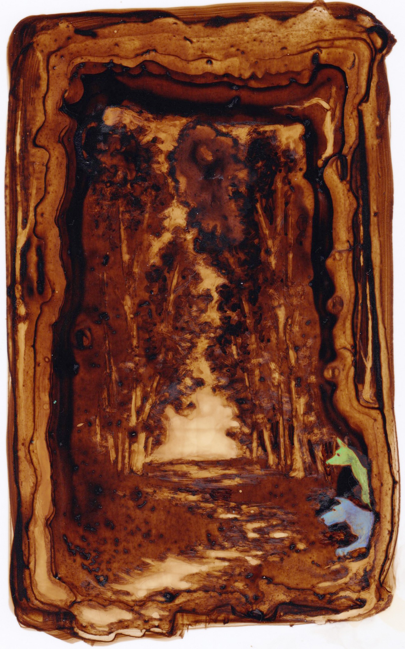 Posé sur le papier, le brou de noix génère matières et formes, propices à l'imaginaire ; Il n'y a plus qu'à poursuivre l'aléatoire ... Et le numérique rajoute ses pixels et continue l'image.