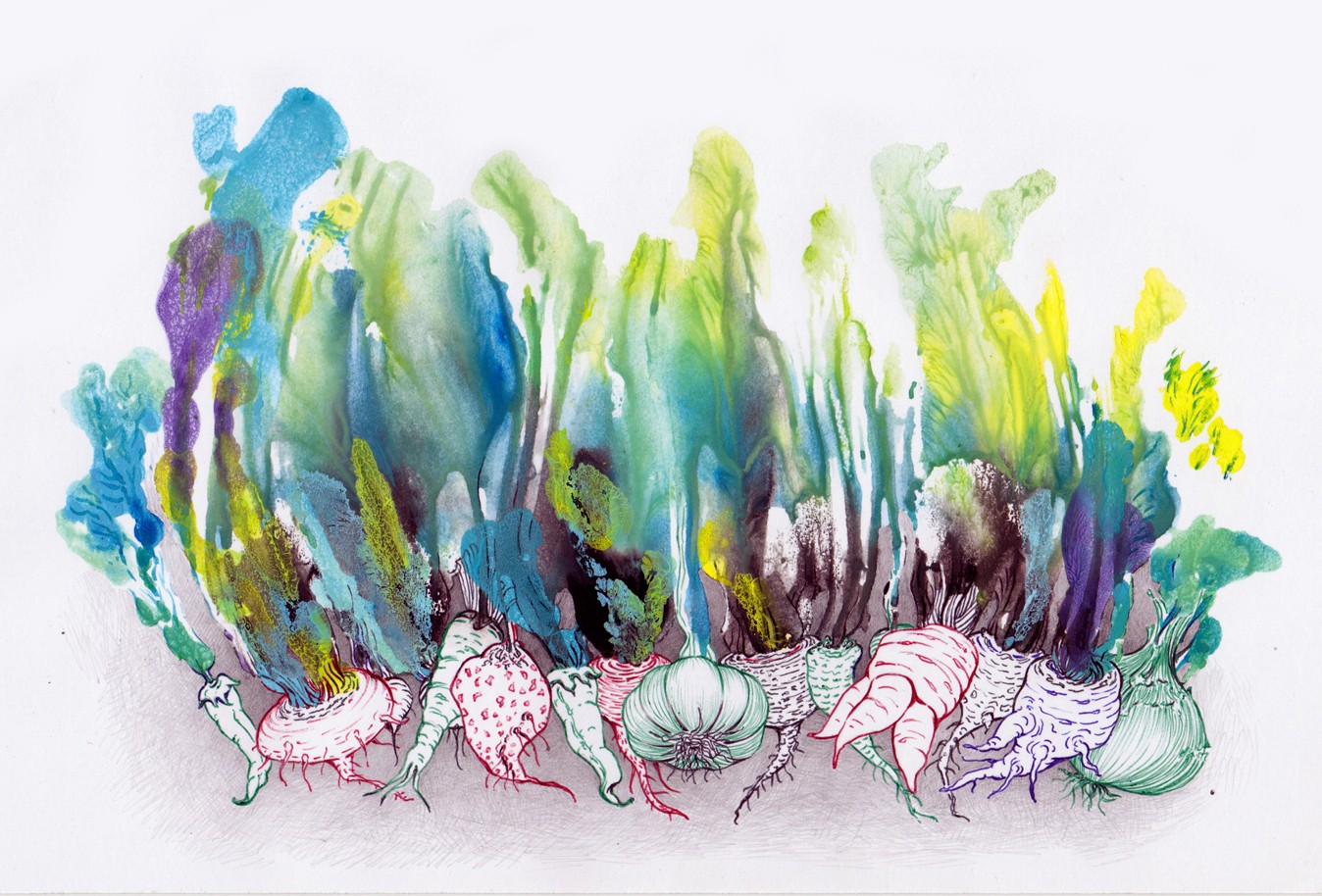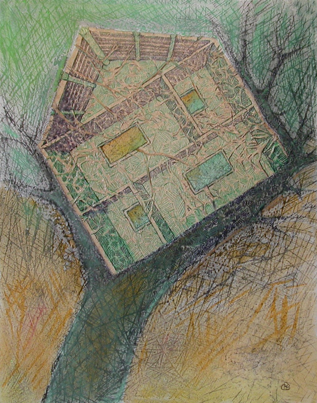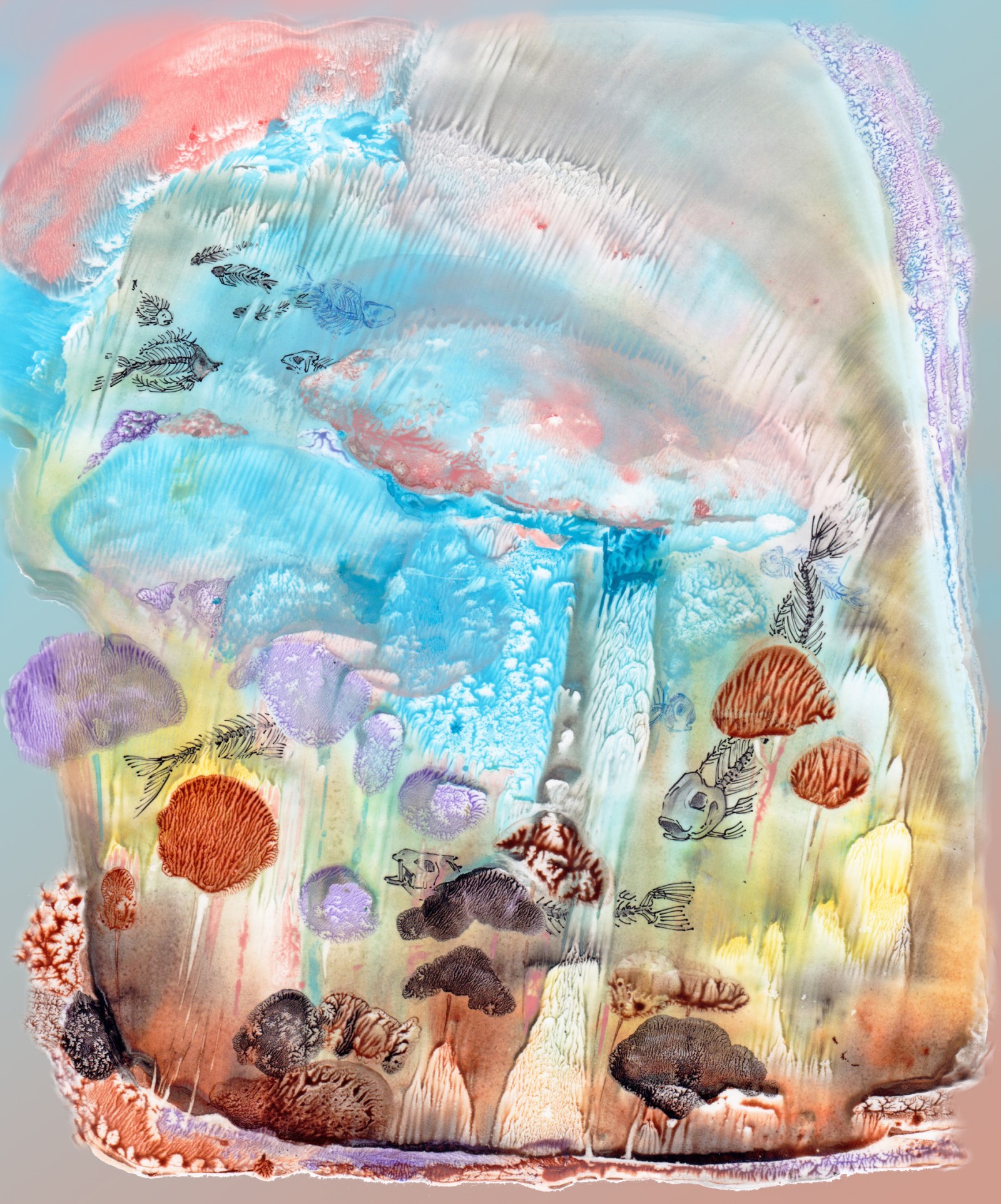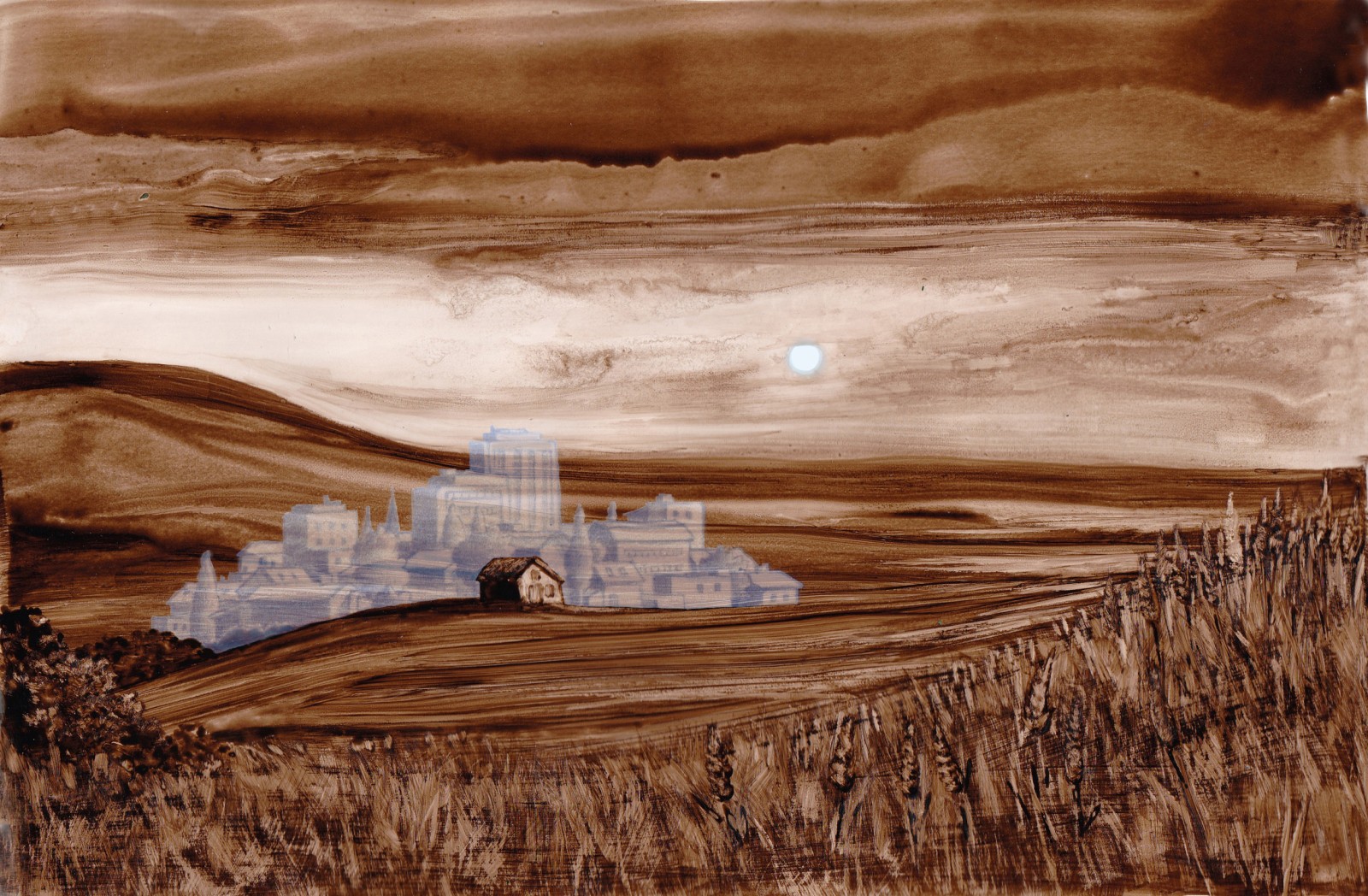 Posé sur le papier, le brou de noix génère matières et formes, propices à l'imaginaire ; Il n'y a plus qu'à poursuivre l'aléatoire ... Et le numérique rajoute ses pixels et continue l'image.